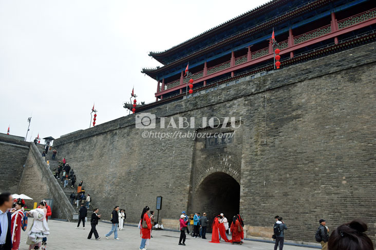 14時半からは、旅の最初に訪れる予定だった西安城壁へ。入場口はいくつかありますが、今回は一番人気の南門(永寧門)から入場することに。城壁の上はレンタサイクルで一周するのが人気ですが、一部分を徒歩で散策するだけでも十分に満足できました。