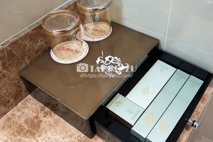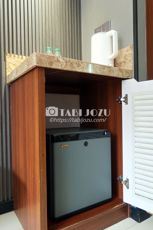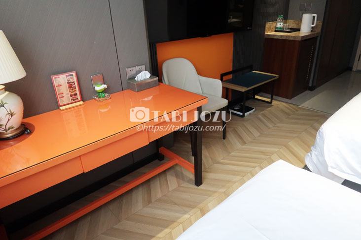 ミニバーには冷蔵庫や電気ケトル、無料のミネラルウォーター2本が用意されています。中国では冷蔵庫のないホテルも多いので、客室にしっかり備わっているのは嬉しいポイントです。また、ルームサービスは町中の食堂とほとんど変わらない値段で、気軽に注文しやすい印象でした。