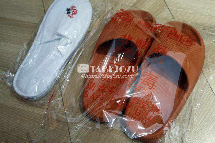 スリッパは使い捨てタイプとゴムタイプの2種類が用意されていて、どちらも使いやすかったです。使い捨てタイプは底にほどよい厚みがあって履き心地がよく、ゴムタイプは消毒済みなのが安心できるポイントでした。