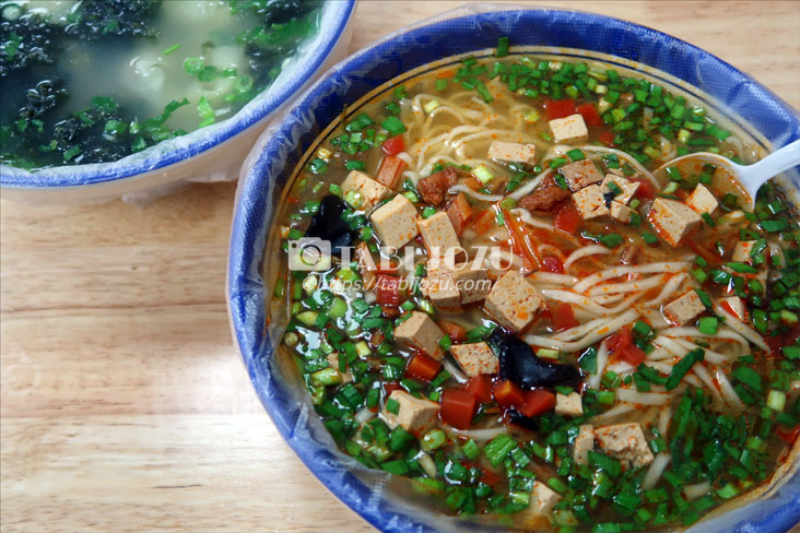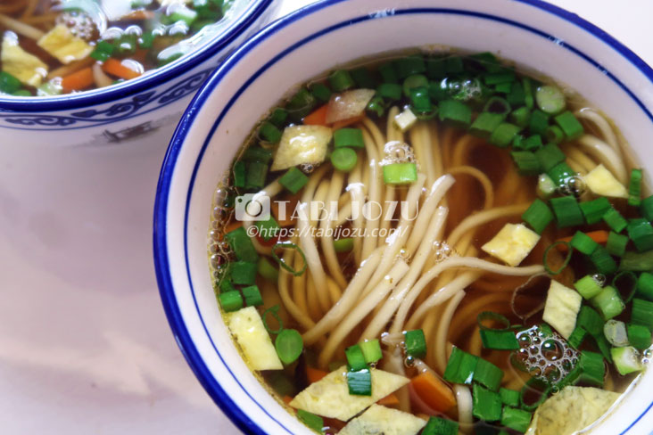そこで、ホテルと同じ通りにあるローカル向けの安めの食堂で、着いてすぐにランチを食べてみることに。ワンタンスープ(15元)と臊子面(15元)を注文。どちらも辛くなくて食べやすく、ダシが効いていて美味しかったです。