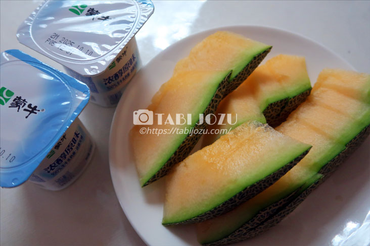 小分けパウチのヨーグルトが用意されていて嬉しかったです。さすが国土の大きい中国、晩秋なのにメロンが食べられました。季節外れのフルーツに出会えるのも、旅ならではの楽しさですね。