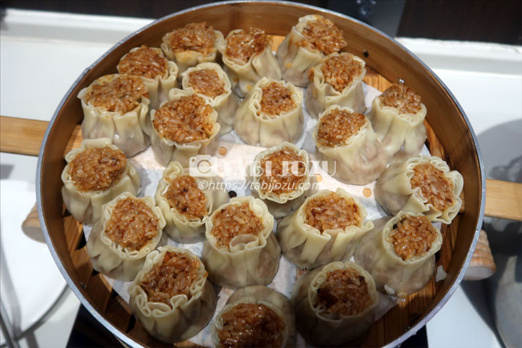 せいろで蒸された、炊き込みご飯のような具が詰まった焼売。しゅうまいのような見た目ですが、中身は醤油風味のご飯で優しい味わいでした。