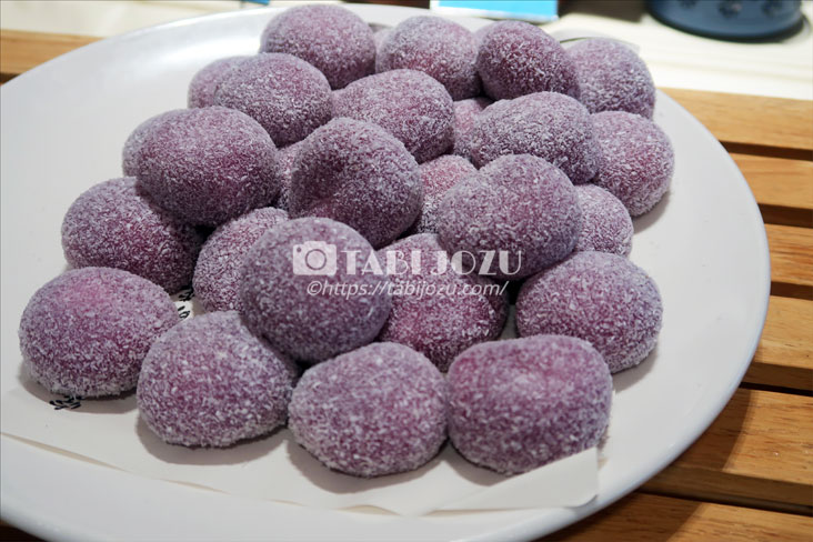 むらさきいもを使ったもちもち食感の団子。外側に白い粉がまぶされていて、ほんのり甘くて朝でも食べやすい素朴な味でした。