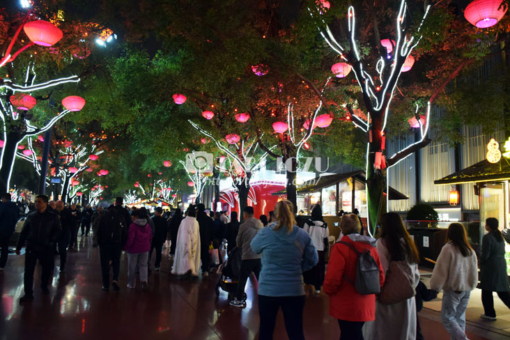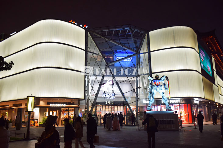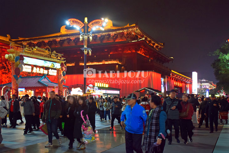 大唐不夜城は夜になると一気に華やかになり、建物のライトアップや巨大なオブジェが光に照らされてとてもフォトジェニックな雰囲気になります。通り沿いにはパフォーマンスや音楽が流れていて、歩いているだけで“西安らしい夜のにぎわい”を楽しめました。