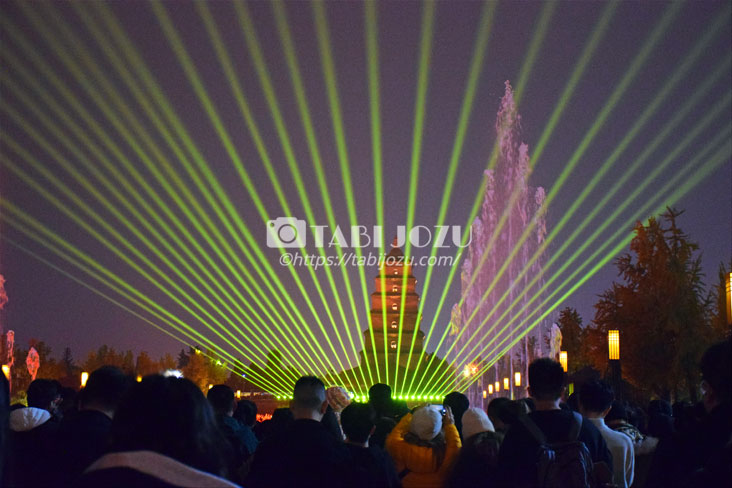 噴水ショーは大雁塔北広場で行われ、ホテルから歩いて3分もかからない距離なので、気軽に見に行けます。私たちも19時のスタートまで部屋でゆっくり休んでから向かえて助かりました。